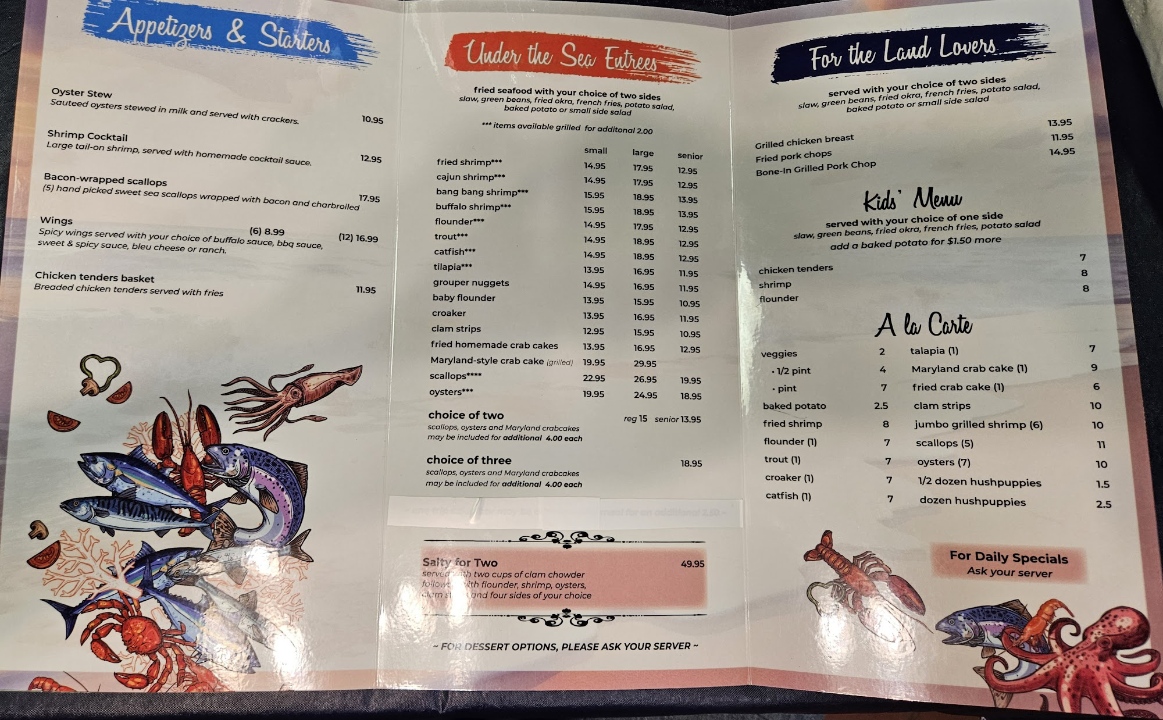 If you're someone who loves variety, you'll appreciate the extensive menu at Salty Shores 2. Beyond the standard Calabash platters, the menu features a wide array of appetizers, sides, and sandwiches. You can start off with the crispy hushpuppies or a plate of fried green tomatoes, which perfectly complement the seafood. For those looking for something lighter, the seafood salad or the clam chowder is always a hit.